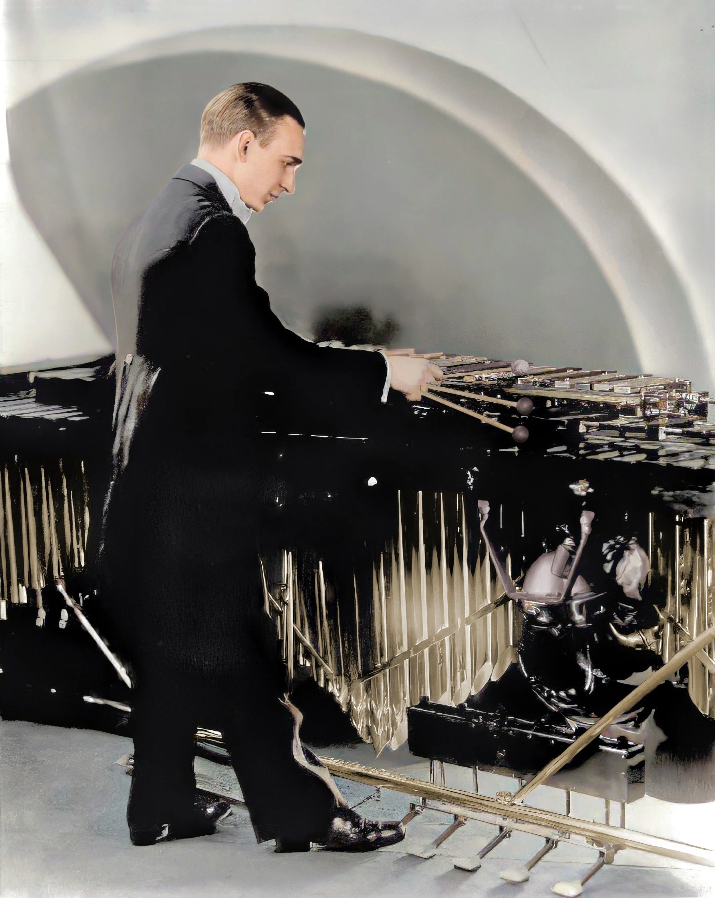 The horns were gold plated, and the resonators were brass. There is a non-functional decorative row of resonators between the celeste and the marimba chromatics. These were anodized bronze to make them distinguishable between the adjacent rows of brass. The front marimba resonators are arranged with a double arch to accommodate placement of the horns. The oak rails of the frame are covered in nickel-plated metal, with two nickel-plated metal struts supporting the vibes rails.