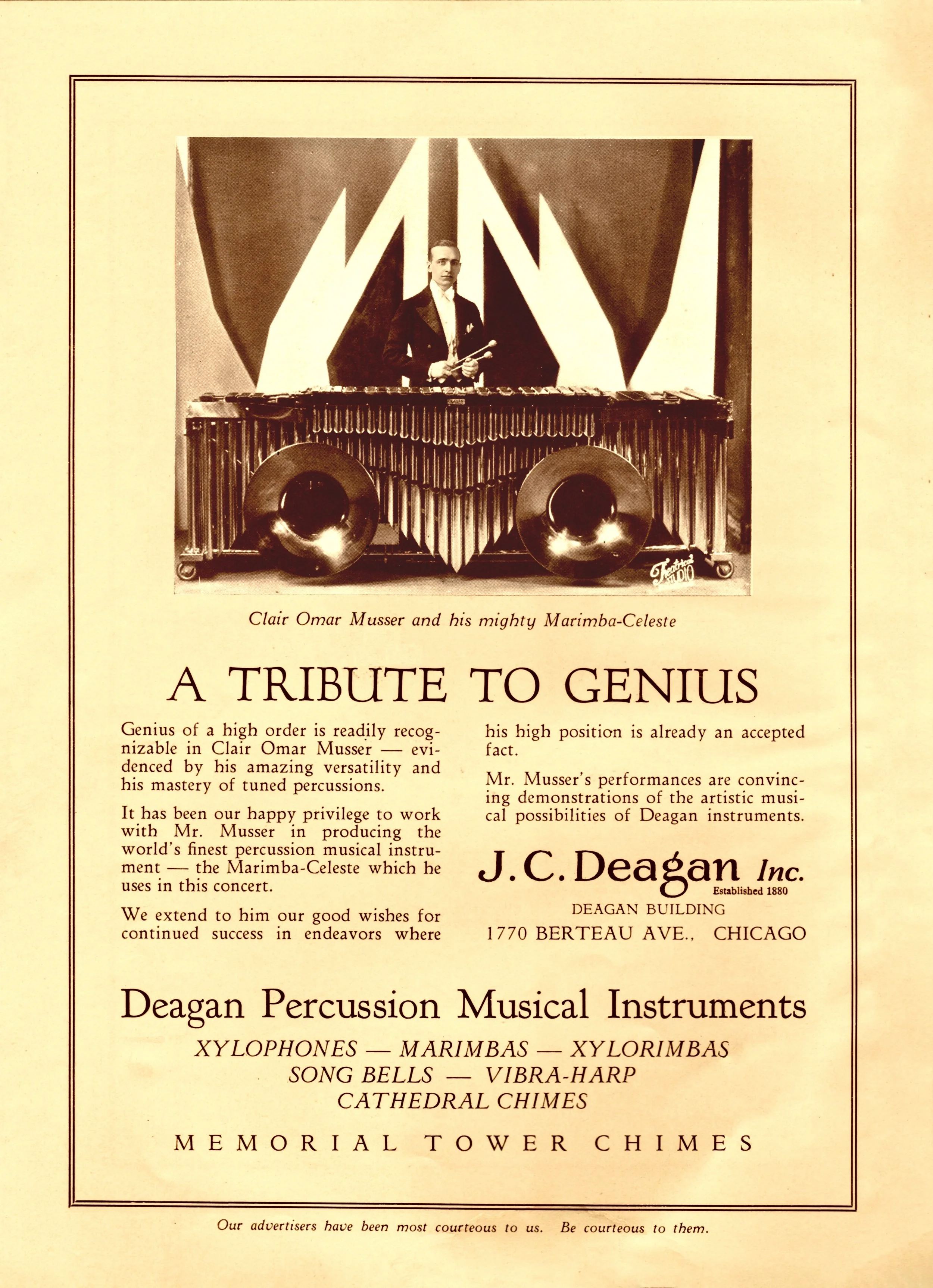 “We made acquaintance last night with a new instrument and an artist new to this reviewer. The marimba-celeste was played by Clair Omar Musser in Orchestra Hall. . . . he is without a doubt a remarkable virtuoso, a master of the instrument. . . the marimba-celeste combines the glitter and brilliance of the marimba with the delicacy of the celeste and may perhaps be called the apotheosis of the xylophone.”
