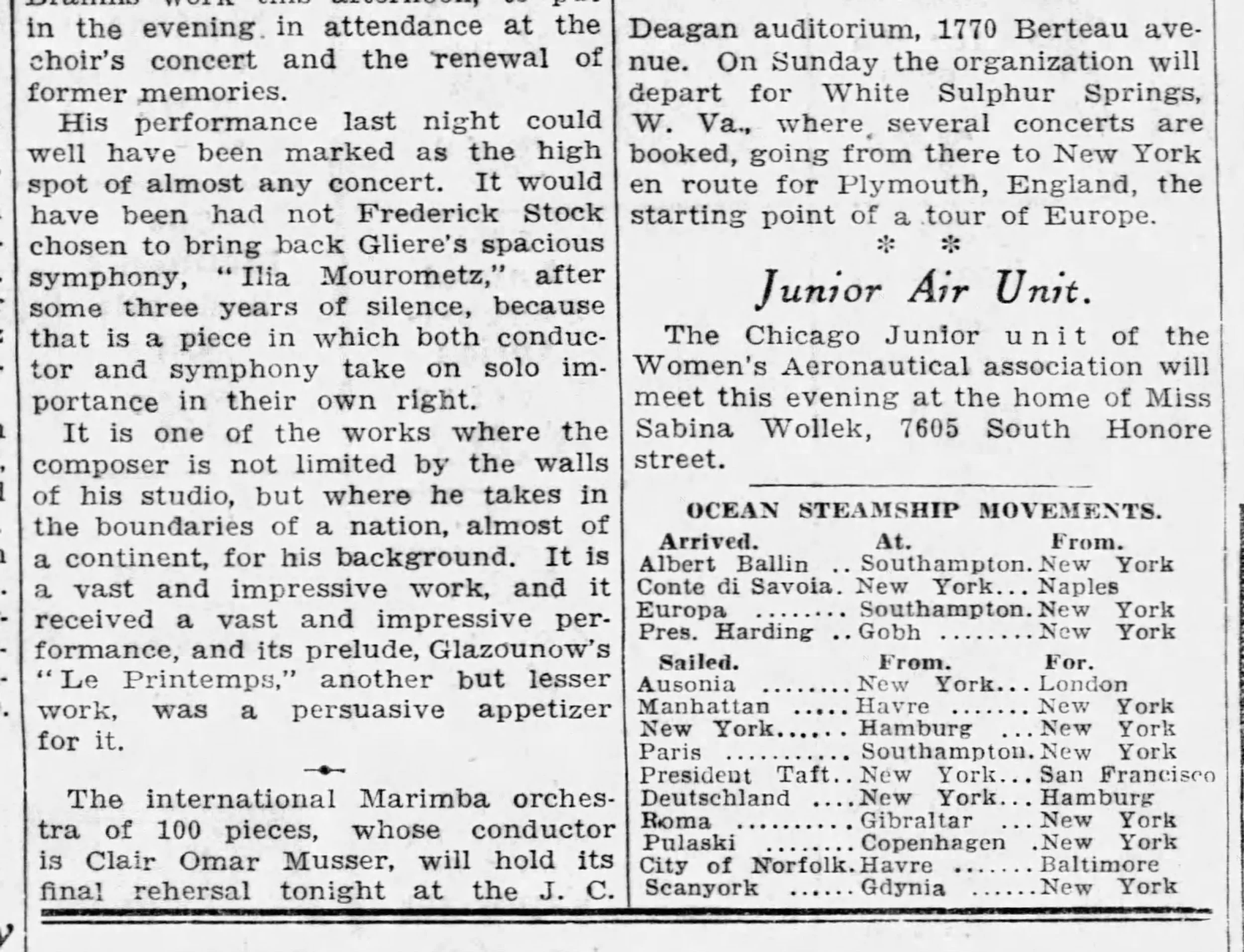 It should be noted that two years prior to the IMSO tour, Musser had created another 100-member marimba ensemble, the Century of Progress Marimba Orchestra, which did in fact perform in Chicago together in its entirety. However, the venue for those performances was outdoors in the court of the Science Pavilion at the 1933 Century of Progress Exposition. That open-air spaciousness accommodated the 100 marimbas and their performers easily, unlike the confines of an indoor concert hall stage.