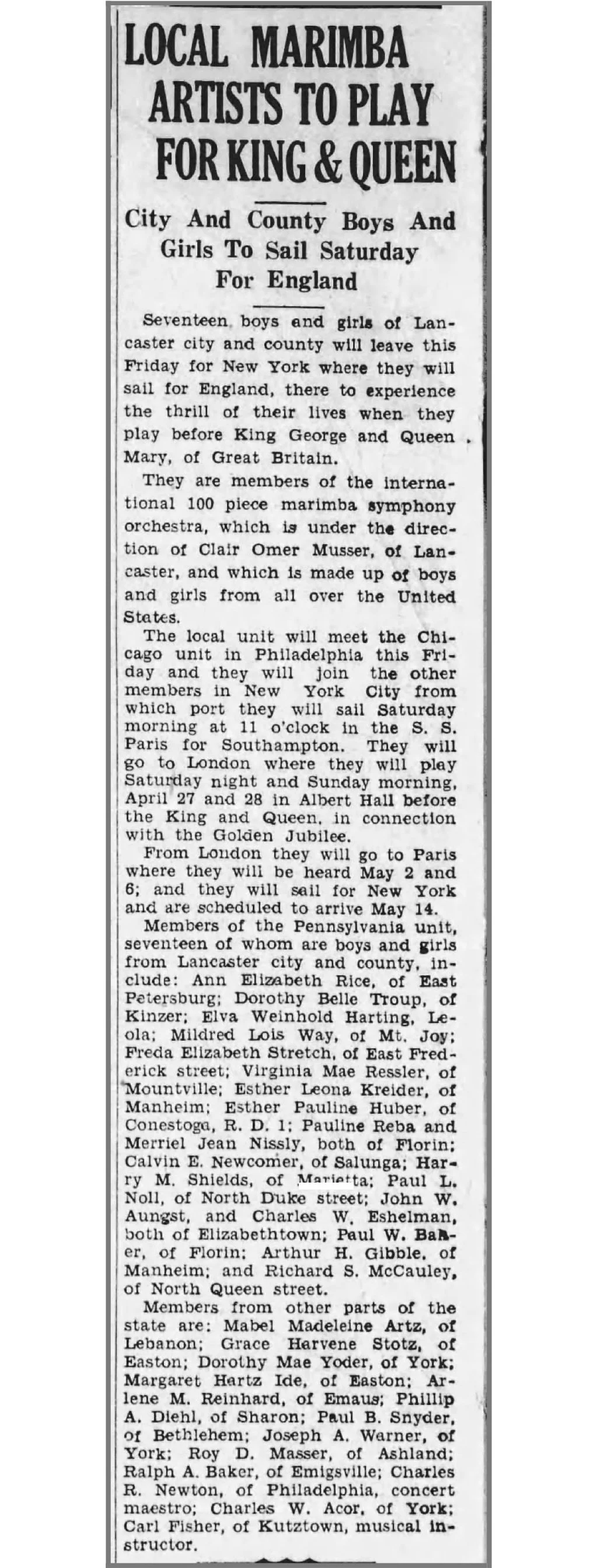In May 1935, King George V of England celebrated his Sliver Jubilee, marking 25 years on the throne. Massive celebrations took place in London preceding that event, to herald this milestone in British public life. Clair Musser seized this moment to form a 100 piece marimba orchestra for the purpose of traveling to England to perform on this auspicious occasion, as this represented an opportunity for worldwide recognition of the marimba. Because the itinerary was international, the name of the ensemble was the International Marimba Symphony Orchestra. Musser was Director, Conductor, and Arranger of this massive ensemble. [Photos 1, 2, & 3]